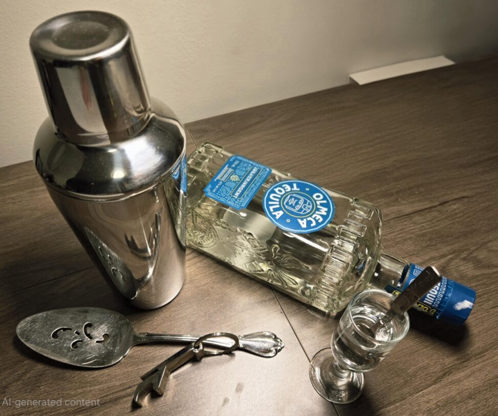 The photo demonstrates the approximate placement of the elements for this assignment project. The cocktail mixer was relocated to the top right corner (later on) to enhance the overall composition by adding an additional element with distinct reflection and refraction characteristics.